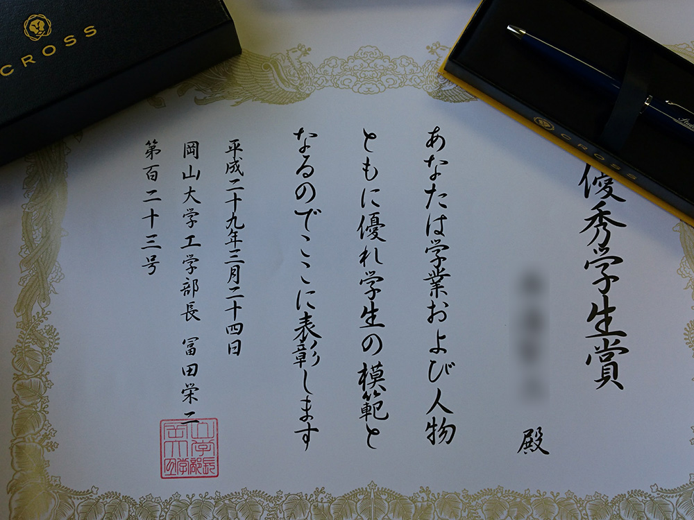 岡山大学工学部電気通信系学科電子工学コースの「優秀学生賞」を受賞して卒業しました。